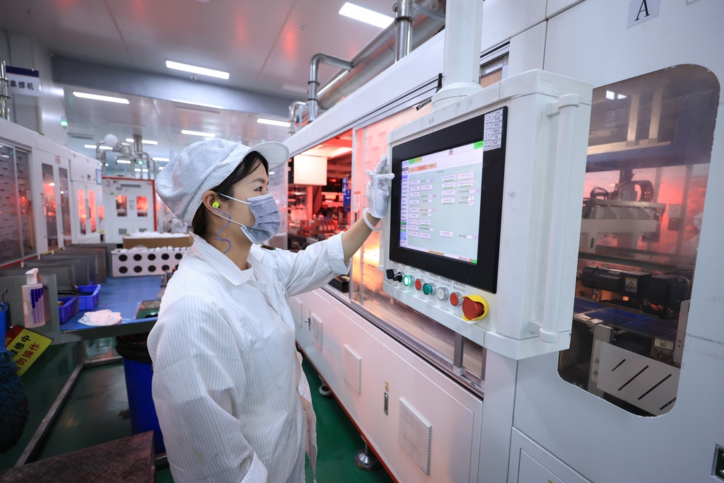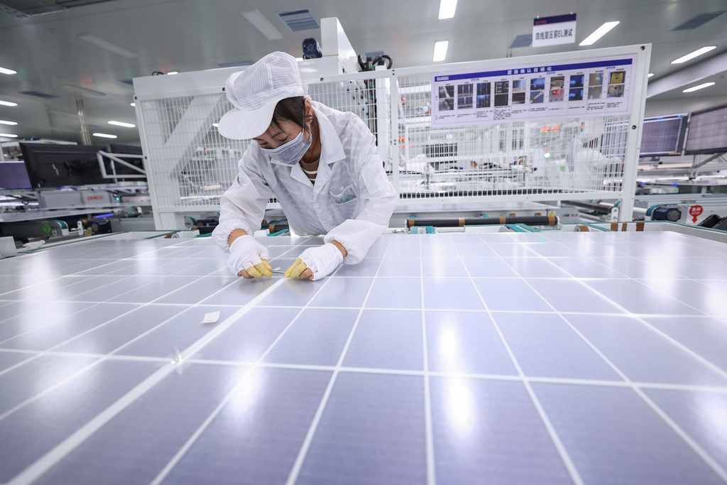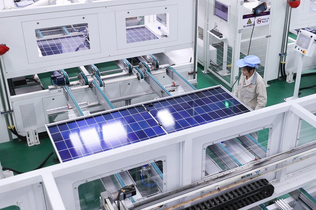 配文:10月15日,江蘇省連云港市贛榆經濟開發區一家新能源企業,工人正在加緊生產一批出口海外的太陽能光伏電池組件。